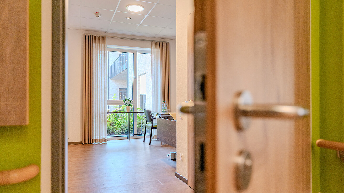 Die Einzel-Zimmer sind modern und funktional eingerichtet. Dazu gehören ein elektrisch höhenverstellbares Pflegebett, das individuell an die Bedürfnisse angepasst werden kann, ein praktischer Nachttisch, ein geräumiger Kleiderschrank, Sideboard, Tisch und Stühle, ein separates Bad sowie ein Fernseher.